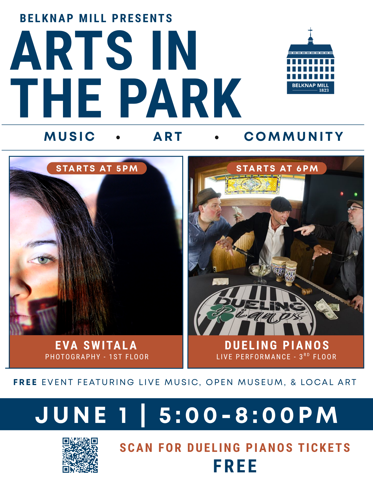Back to All Events Arts in the Park Friday, June 5, 2026 5:00 PM 8:00 PM The Belknap Mill 25 Beacon Street East Laconia, NH, 03246 United States (map) Google Calendar ICS